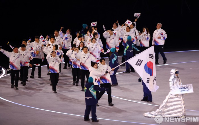 [코르티나담페초=로이터뉴스핌] 6일 이탈리아 코르티나담페초에서 열린 2026 밀라노-코르티나 동계 올림픽 개막식에서 대한민국 선수단이 입장하고 있다. 2026.02.07 photo@newspim.com