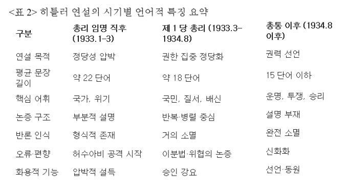 이를 비교해 보면 다음과 같은 특징이 발견된다. 히틀러의 언어는 개인적 성향의 산물이 아니라, 제도적 위치에 따라 기능이 달라진 정치 언어였다. 이를 하나로 묶어 평가하면 분석은 참으로 어려워진다. 따라서 그의 연설은 기간별로 분해해 분석되어야 한다.