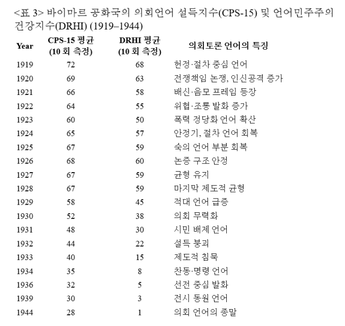 1934년 이후의 수치는 민주주의 언어의 사후 기록에 가깝다. '찬동·명령 언어', '선전 중심 발화', '전시 동원 언어'를 거쳐 1944년에 이르면 DRHI는 1까지 떨어진다. 이는 의회 언어가 완전히 소멸했음을 뜻한다. 의회는 존재했을지 모르지만, 그곳에서는 더 이상 민주주의적 언어가 생산되지 않았다. 말은 명령이 되었고, 명령은 곧 운명과 동일시되었다. 이 표가 말해주는 가장 중요한 사실은, 히틀러가 권력을 장악했기 때문에 의회 언어가 무너진 것이 아니라, 의회 언어가 먼저 무너졌기 때문에 히틀러의 권력 장악이 가능해졌다는 점을 우회적으로 설명하고 있다.