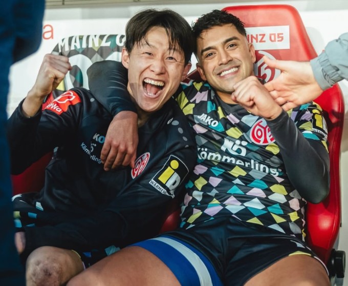 [서울=뉴스핌] 박상욱 기자 = 이재성(왼쪽)과 아미리가 7일(현지시간) 분데스리가 21라운드 홈 경기에서 아우크스부르크를 꺾고 벤치에서 기뻐하고 있다. [사진=마인츠 SNS 2026.02.08 psoq1337@newspim.com