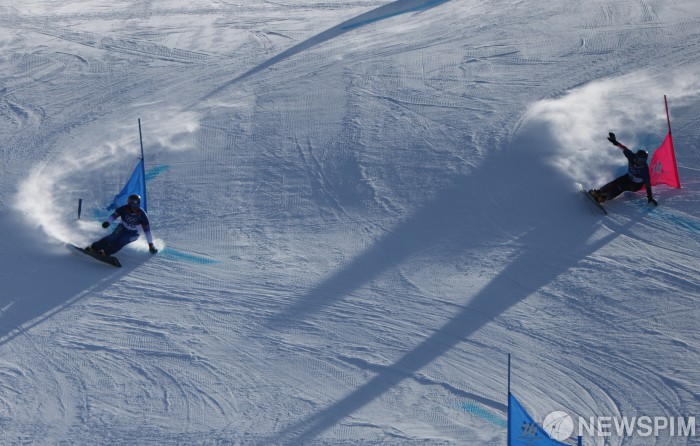 [리비뇨=로이터뉴스핌] 밀라노-코르티나 2026 동계올림픽 스노보드 남자 평행 대회전 예선에서 대한민국 이상호(왼쪽)와 오스트리아 안드레아스 프로메거가 8일 이탈리아 리비뇨 리비뇨 스노 파크에서 경기를 펼치고 있다. 2026.02.08 photo@newspim.com