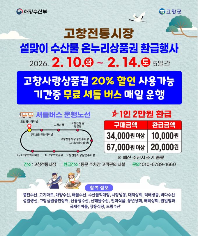 군은 오는 10일부터 14일까지 5일간 고창전통시장에서 온누리상품권 환급행사를 실시하고, 무료 셔틀버스를 기존보다 확대해 매일 운행한다고 9일 밝혔다.