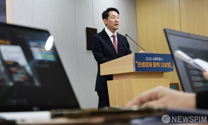 [서울=뉴스핌] 양윤모 기자 = 오세훈 서울시장이 9일 오전 서울시청 브리핑룸에서 개최된 '2026 민생경제 활력 더보탬'기자설명회에 참석해 발표를 하고 있다. 서울시는 총 2조7906억원을 지원해 소상공인, 골목 상권, 소비자, 취약 노동자 등 경제 불황 속 가장 먼저 위기에 직면하는 4대 계층에 대한 활력 회복을 주요 내용으로 하는 '2026년 민생경제 활력 더보탬'을 발표했다. 2026.02.09 yym58@newspim.com