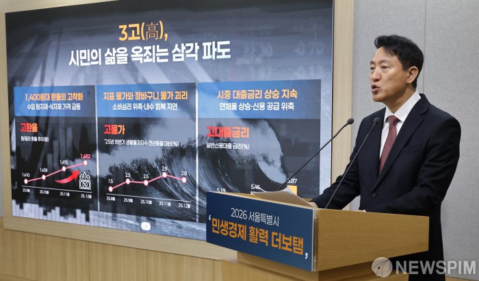 [서울=뉴스핌] 양윤모 기자 = 오세훈 서울시장이 9일 오전 서울시청 브리핑룸에서 개최된 '2026 민생경제 활력 더보탬'기자설명회에 참석해 발표를 하고 있다. 서울시는 총 2조7906억원을 지원해 소상공인, 골목 상권, 소비자, 취약 노동자 등 경제 불황 속 가장 먼저 위기에 직면하는 4대 계층에 대한 활력 회복을 주요 내용으로 하는 '2026년 민생경제 활력 더보탬'을 발표했다. 2026.02.09 yym58@newspim.com