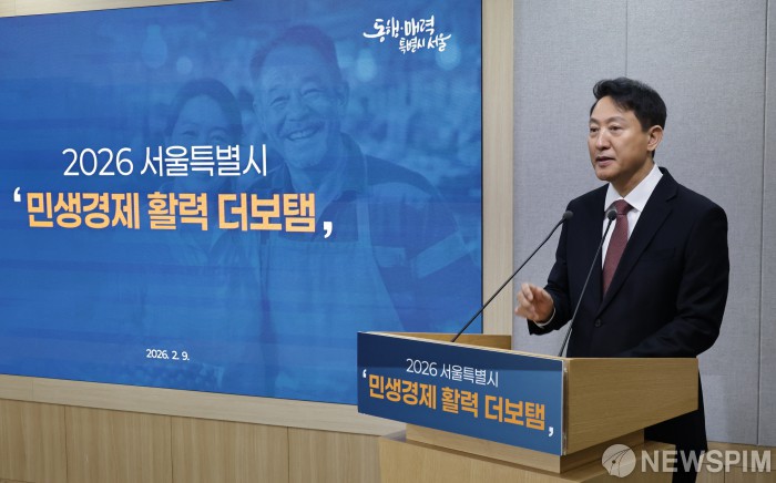 [서울=뉴스핌] 양윤모 기자 = 오세훈 서울시장이 9일 오전 서울시청 브리핑룸에서 개최된 '2026 민생경제 활력 더보탬'기자설명회에 참석해 발표를 하고 있다. 서울시는 총 2조7906억원을 지원해 소상공인, 골목 상권, 소비자, 취약 노동자 등 경제 불황 속 가장 먼저 위기에 직면하는 4대 계층에 대한 활력 회복을 주요 내용으로 하는 '2026년 민생경제 활력 더보탬'을 발표했다. 2026.02.09 yym58@newspim.com