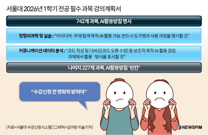[서울=뉴스핌] 김영은 기자 = 새 학기 개강이 보름도 채 남지 않았지만, 서울대학교가 인공지능(AI) 활용 방침을 두고 혼란에 빠졌다. 학교 측이 올해 처음으로 강의계획서에 'AI 도구 활용 방침'을 명시하도록 했지만, 전공필수 과목 4개 중 1개꼴로 해당 항목이 비어 있는 것으로 나타났기 때문이다.