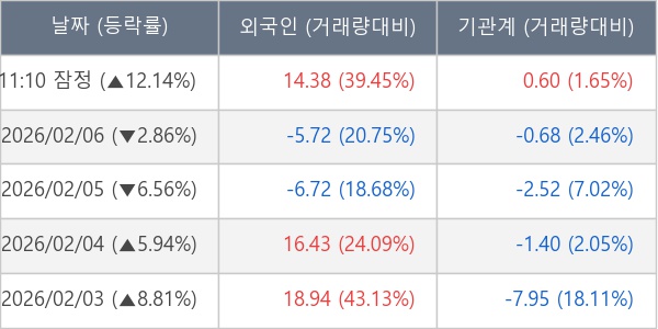 [서울=뉴스핌] 로보뉴스 = 09일 11시 30분 현재 산일전기(062040)는 외국인과 기관이 각각 14.38 만 주, 0.60 만 주 순매수(잠정) 하면서 전일 대비 12.14% (현재가 159,800원) 상승하고 있다.