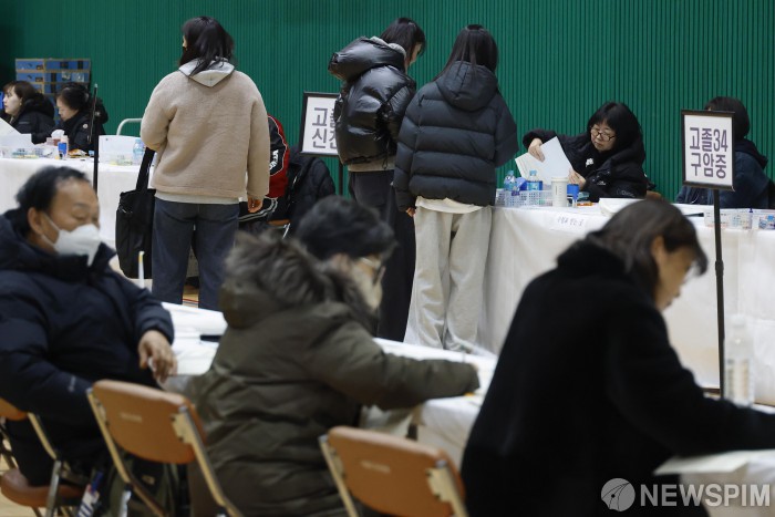 [서울=뉴스핌] 류기찬 기자 = 2026년도 제1회 초·중·고졸 검정고시 응시 원서 접수일인 9일 오후 서울 동작구 서울공업고등학교 체육관을 찾은 검정고시 응시생들이 원서를 작성하고 있다. 2026.02.09 ryuchan0925@newspim.com