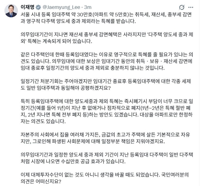 이 대통령은 이날 사회관계망서비스(SNS) 엑스(X·옛 트위터)에 "서울 시내 등록 임대주택 약 30만호(아파트 약 5만호)는 취득세, 재산세, 종합부동산세 감면과 영구적 다주택 양도세 중과 제외라는 특혜를 받는다"며 "의무임대기간이 지나면 재산세 종부세 감면혜택은 사라지지만 '다주택 양도세 중과 제외' 특혜는 계속되게 돼 있다"고 문제를 제기했다.