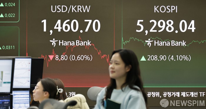 [서울=뉴스핌] 양윤모 기자 = 미국발 훈풍에 힘입어 9일 오후 코스피가 전장 종가보다 208.90 포인트(4.10%) 상승하며 5298.04로, 코스닥은 46.78 포인트(4.33%) 상승한 1127.25 로 거래를 마감한 가운데, 서울 중구 하나은행본점 딜링룸에서 직원들이 업무를 보고 있다. 서울외환시장에서 달러/원 환율은 전장 대비 8.80원 하락한 1460.70원에 주간거래를 마감했다. 2026.02.09 yym58@newspim.com