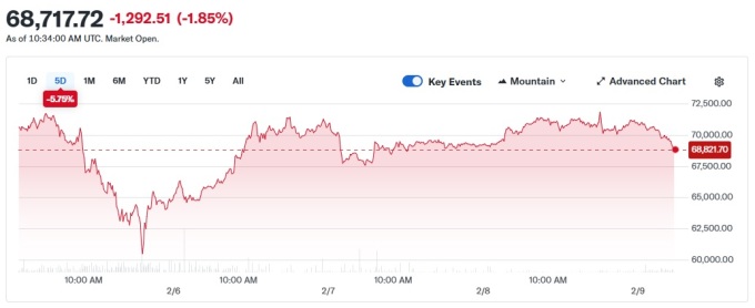 정치적 불확실성이 해소되자 위험자산 선호 심리도 빠르게 확산됐다. 일본 증시 급등 여파는 글로벌 시장으로 번지며 금 가격은 온스당 5000달러를 돌파했고, 비트코인(BTC)은 오전 한때 7만2000달러까지 치솟았으나 오후 들어 상승폭을 모두 반납하며 한국시간 오후 7시 40분 기준 6만8000달러 선에 거래되고 있다. 이더리움(ETH) 역시 장중 2130달러선까지 올랐으나 현재는 24시간 전에 비해 3.7% 내린 2018달러에 거래되고 있다.