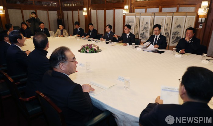[서울=뉴스핌] 이형석 기자 = 김민석 국무총리가 김영록 전남도지사, 강기정 광주시장과 함께 9일 오후 서울 종로구 총리공관에서 전남광주행정통합 관련 면담을 하고 있다. 2026.02.09 leehs@newspim.com