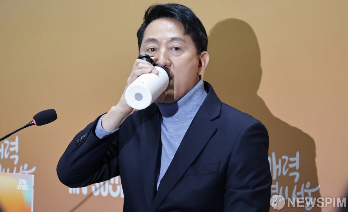 [서울=뉴스핌] 양윤모 기자 = 오세훈 서울시장이 10일 오전 서울 중구 서울시청 대회의실에서 개최된 '2026년 출입기자단 신년 간담회'에 참석해 텀블러로 물을 마시고 있다. 2026.02.09 yym58@newspim.com