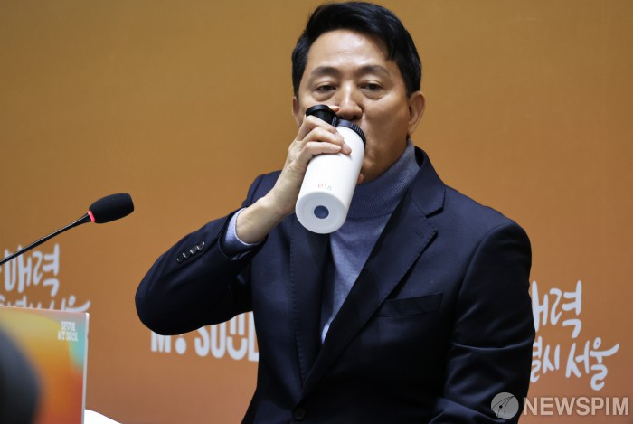 [서울=뉴스핌] 양윤모 기자 = 오세훈 서울시장이 10일 오전 서울 중구 서울시청 대회의실에서 개최된 '2026년 출입기자단 신년 간담회'에 참석해 텀블러로 물을 마시고 있다. 2026.02.09 yym58@newspim.com