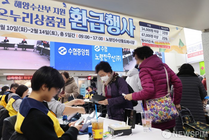 [서울=뉴스핌] 양윤모 기자 = 설명절을 앞둔 10일 서울 동작구 노량진수산시장에서 수산물을 구입한 시민들이 온누리상품권 환급을 받고 있다. 설을 맞아 14일까지 진행하는 이번 행사는 농림축산식품부, 해양수산부가 각각 국산 농축산물, 수산물에 대해 전국에서 추진한다. 행사 기간 중 참여 점포에서 국산 신선 농축산물 또는 수산물을 구매한 소비자는 구매 금액의 최대 30%를 온누리상품권으로 환급받을 수 있다. 2026.02.10 yym58@newspim.com