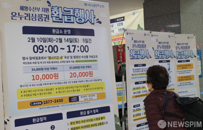[서울=뉴스핌] 양윤모 기자 = 설명절을 앞둔 10일 서울 동작구 노량진수산시장에서 수산물을 구입한 시민들이 온누리상품권 환급을 받고 있다. 설을 맞아 14일까지 진행하는 이번 행사는 농림축산식품부, 해양수산부가 각각 국산 농축산물, 수산물에 대해 전국에서 추진한다. 행사 기간 중 참여 점포에서 국산 신선 농축산물 또는 수산물을 구매한 소비자는 구매 금액의 최대 30%를 온누리상품권으로 환급받을 수 있다. 2026.02.10 yym58@newspim.com