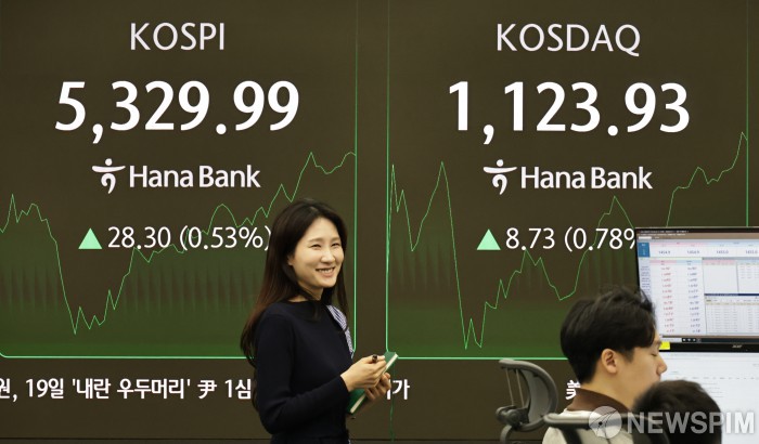 [서울=뉴스핌] 양윤모 기자= 11일 오전 코스피가 전장 종가보다 28.30포인트(0.53%) 상승하며 5329.99 로, 코스닥은 8.73 포인트(0.78%) 상승한 1123.93으로 거래를 시작한 가운데, 서울 중구 하나은행본점 딜링룸에서 직원들이 업무를 보고 있다. 서울외환시장에서 달러/원 환율은 전장 대비 4.40원 하락한 1454.70원에 주간거래를 시작했다. 2026.02.11 yym58@newspim.com