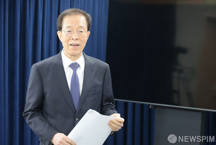 [서울=뉴스핌] 이길동 기자 = 이석연 국민통합위원회 위원장이 11일 서울 종로구 정부서울청사에서 국민통합을 위한 5대 사회갈등 국민인식조사 결과 발표를 위해 브리핑룸에 들어서고 있다.2026.02.11 gdlee@newspim.com