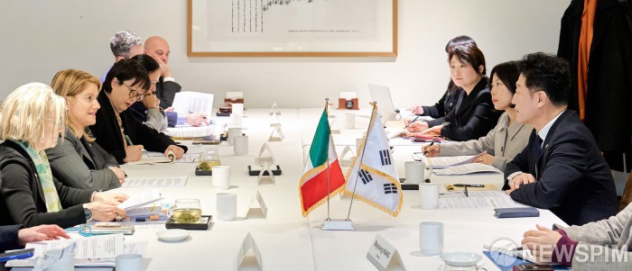 [서울=뉴스핌] 이호현 기후에너지환경부 2차관이 11일 서울 중구 달개비에서 한-이탈리아 정상회의 후속조치로 마리아 트리포디(Maria Tripodi) 이탈리아 외교협력부 차관과 만나 에너지 전환과 순환경제 분야에서의 협력 방안에 대해 논의하고 있다.[사진= 기후에너지환경부] 2026.02.11 photo@newspim.com