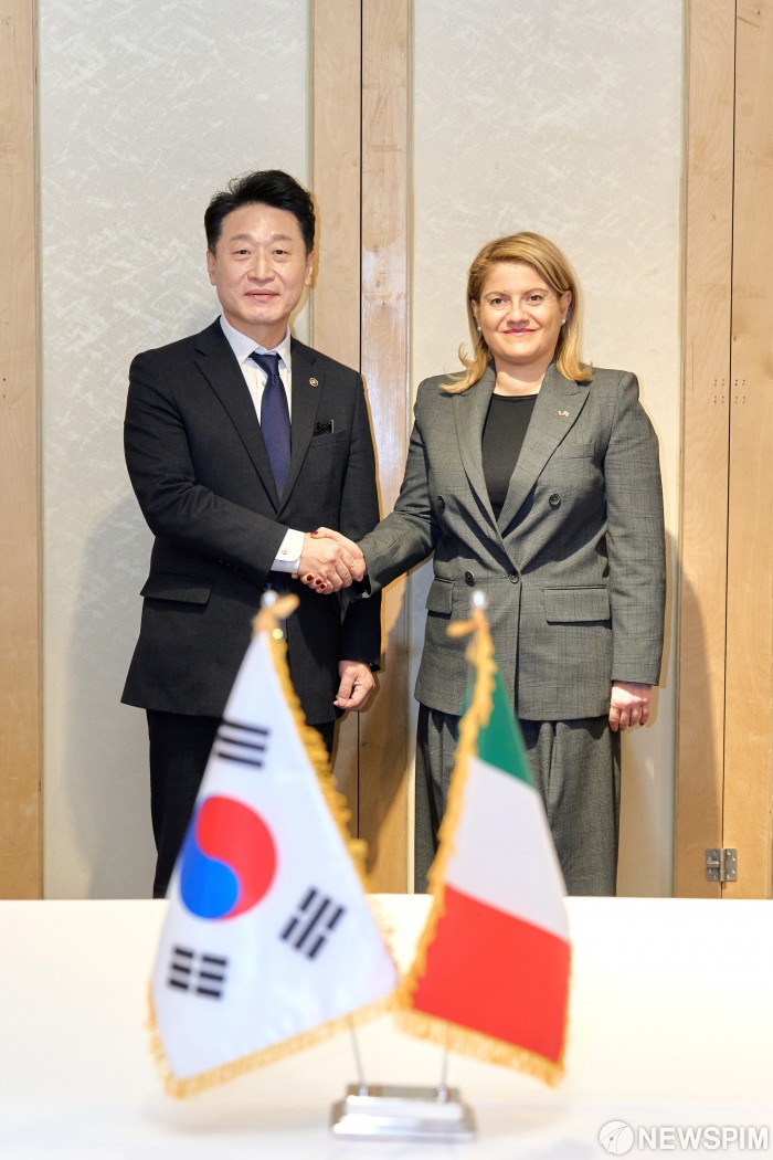 [서울=뉴스핌] 이호현 기후에너지환경부 2차관이 11일 서울 중구 달개비에서 한-이탈리아 정상회의 후속조치로 마리아 트리포디(Maria Tripodi) 이탈리아 외교협력부 차관과 만나 회담에 앞서 기념촬영을 하고 있다.[사진= 기후에너지환경부] 2026.02.11 photo@newspim.com