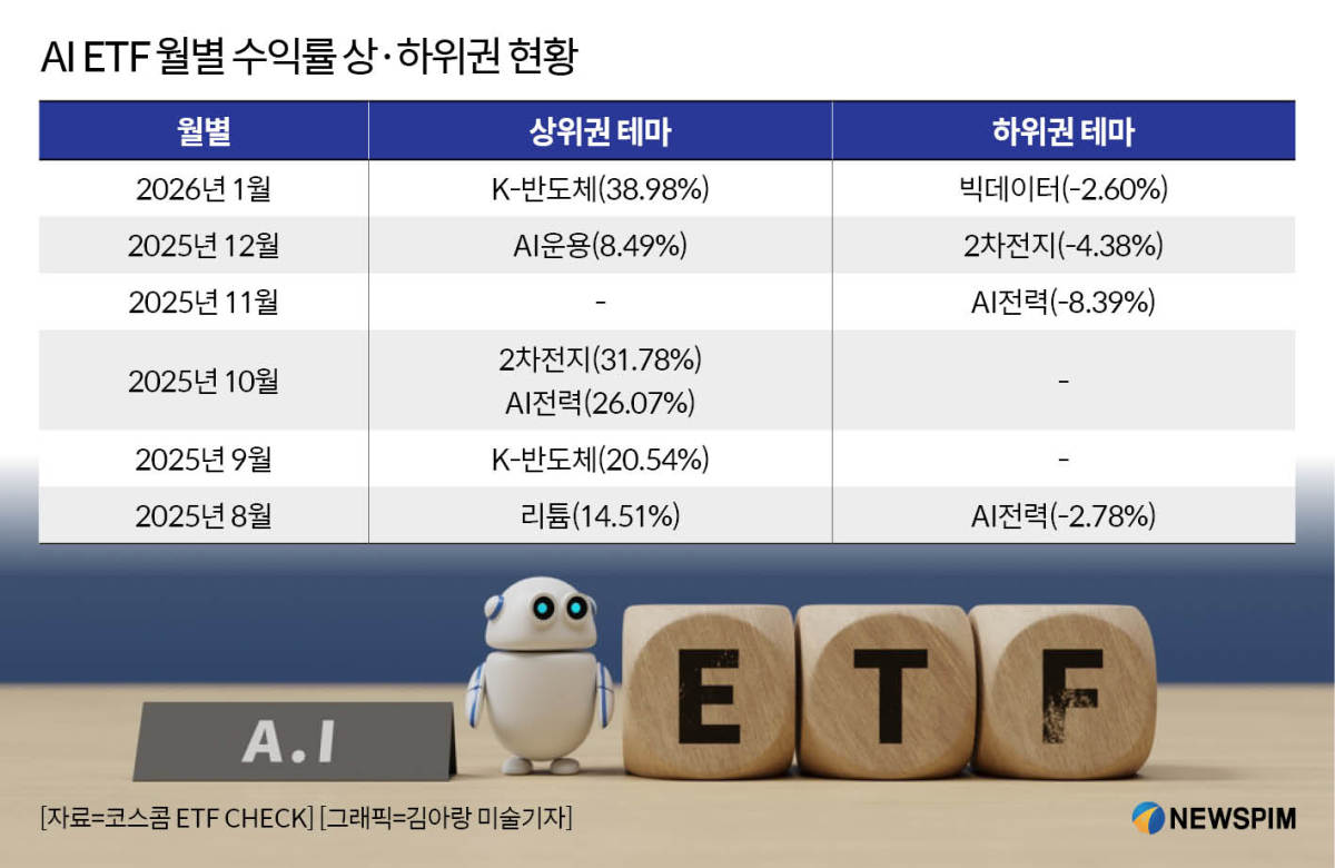 실제로 지난해 12월 월간 수익률 상위권에는 'AI운용(8.49%)' 테마 ETF가 포함됐다. 반면 같은 달 '2차전지(-4.38%)'는 하위권에 머물렀다. 'AI전력' 테마 역시 2025년 11월에는 -8.39%로 부진했지만, 전달인 10월에는 26.07%를 기록하며 상위권에 올랐다. 월별로 주도 영역이 빠르게 교체되는 양상이다.
