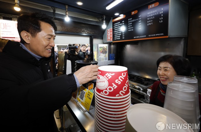 [서울=뉴스핌] 양윤모 기자 = 오세훈 서울시장이 11일 서울 동작구 노량진 만나로 상권에 위치한 한 컵밥집을 찾아 상인과 대화를 나누고 있다. 2026.02.11 2026.02.11 yym58@newspim.com
