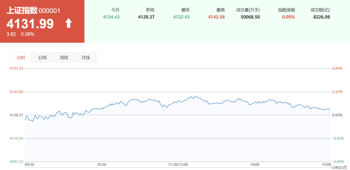 이날 상하이종합지수는 0.09% 상승한 4131.99, 선전성분지수는 0.35% 하락한 14160.93, 촹예반지수는 1.08% 하락한 3284.74로 각각 장을 마감했다.