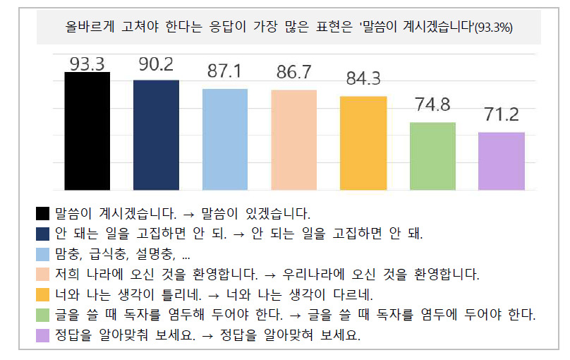 이 외에도 '염두에 두다' 사용 오류(74.8%)와 '(알아)맞추다-(알아)맞히다' 혼동(71.2%) 등 다양한 어법 오류가 개선이 필요한 항목으로 꼽혔다. '글을 쓸 때 독자를 염두해 두어야 한다'는 '염두에 두어야 한다'로, '정답을 알아맞춰 보세요'는 '알아맞혀 보세요'로 고쳐야 한다는 것이다. 이어서 '-충(87.1%)'과 '장애를 앓다(78.7%)'와 같은 혐오∙차별 표현을 개선해야 한다는 응답이 70%를 훨씬 넘는 비율로 나타났다.