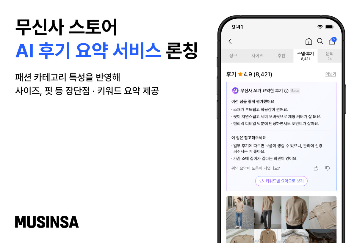 [서울=뉴스핌] 이성화 기자 = 무신사는 인공지능(AI) 기술을 활용해 수만 개의 상품 후기를 한눈에 파악할 수 있는 'AI 후기 요약' 서비스를 선보인다고 12일 밝혔다.