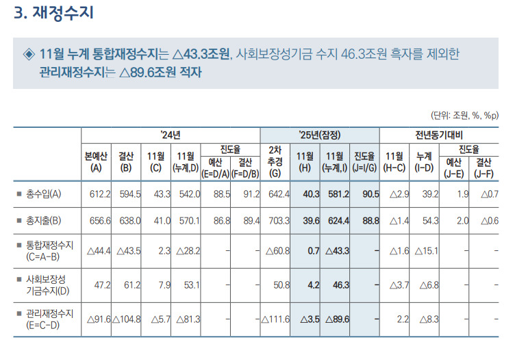 총수입에서 총지출을 뺀 통합재정수지는 지난해 11월까지 43조3000억원 적자를 기록했다. 총지출 규모가 수입 규모를 웃돌면서 나라살림은 적자에 빠졌다.