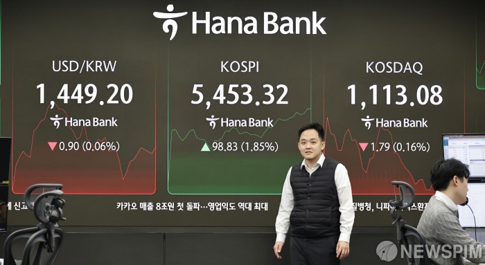 [서울=뉴스핌] 양윤모 기자= 12일 오전 코스피가 전장 종가보다 98.83 포인트(1.85%) 상승하며 5453.32로, 코스닥은1.79포인트(0.16%) 하락한 1113.08로 거래를 시작한 가운데, 서울 중구 하나은행본점 딜링룸에서 직원들이 업무를 보고 있다. 서울외환시장에서 달러/원 환율은 전장 대비 0.90원 하락한 1449.20원에 주간거래를 시작했다. 2026.02.12 yym58@newspim.com