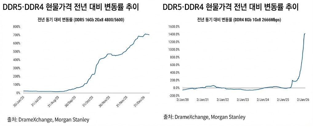 무어 애널리스트는 샌디스크의 2026회계연도 3분기(올해 13월) 가이던스에 상정된 NAND ASP 전 분기 대비 60% 급등, 자사의 내부 팀이 모델링한 삼성전자·SK하이닉스의 1분기 범용 DRAM 가격 각각 48%·55% 상승 전망에 비춰보면 마이크론의 30%는 상대적으로 억제된 수치라고 했다.