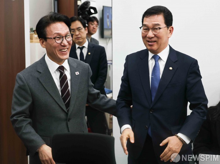 [서울=뉴스핌] 윤창빈 기자 = 김민석 국무총리(왼쪽)가 12일 오전 서울 여의도 국회에서 행정통합 의결을 앞두고 신정훈 국회 행정안전위원장과 회동하고 있다. 2026.02.12 pangbin@newspim.com