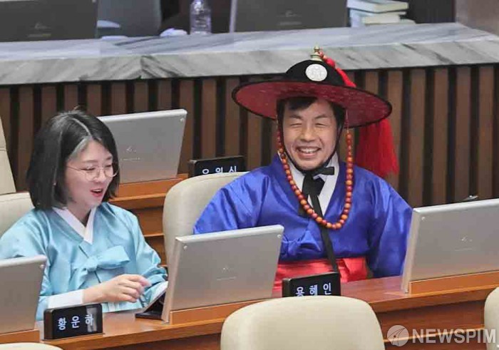 [서울=뉴스핌] 윤창빈 기자 = 윤종오 진보당 원내대표가 12일 서울 여의도 국회에서 열린 본회의에서 사또복을 입고 참석하고 있다. 2026.02.12 pangbin@newspim.com