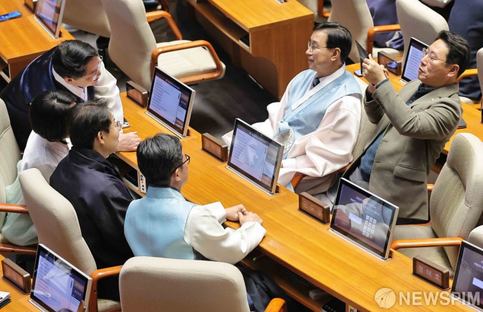 [서울=뉴스핌] 윤창빈 기자 = 12일 서울 여의도 국회에서 열린 본회의에서 더불어민주당 의원들이 한복을 입고 기념촬영을 하고 있다. 2026.02.12 pangbin@newspim.com