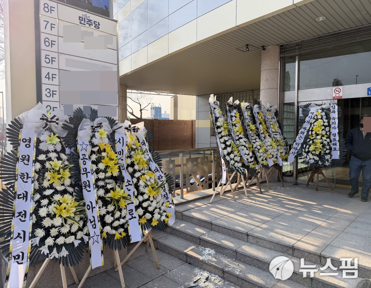 [대전=뉴스핌] 김수진 기자 = 12일 오후 대전충남 행정통합 반대시민모임인 '꿈돌이수호단' 회원들이 대전 중구 더불어민주당 대전시당사 앞에 설치한 근조화환. 2026.02.12 nn0416@newspim.com