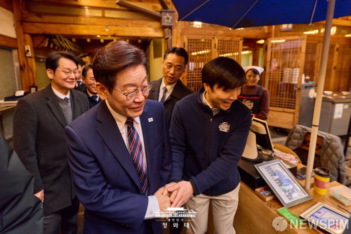 [서울=뉴스핌] 이재명 대통령이 지난 12일 서울 종로구 청와대 인근에서 참모진과 오찬을 했다. 오찬 후 시민들과 인사를 나누고 있다. [사진=청와대] 2026.02.13 photo@newspim.com