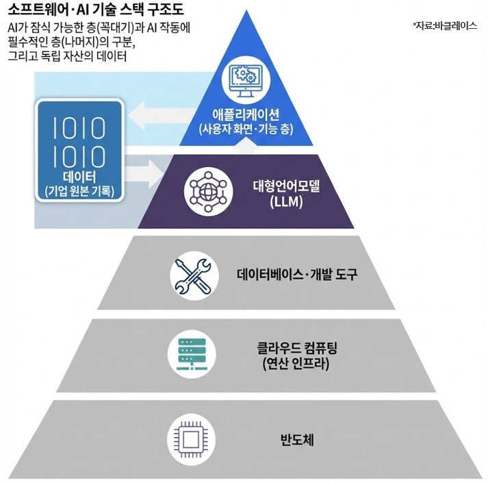 AI가 소프트웨어 기업의 애플리케이션 레이어(사용자가 직접 다루는 화면·기능 층)를 잠식할 수 있다는 판단은 타당하지만 그 아래에 자리한 '시스템 오브 레코드(기록 시스템)' 인프라까지 대체될 것이라는 전제는 잘못됐다고 봤다.