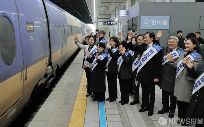 [서울=뉴스핌] 윤창빈 기자 = 조국 조국혁신당 대표를 비롯한 당직자들이 13일 오전 서울 용산구 용산역에서 시민들에 설 귀성인사를 하고 있다. 2026.02.13 pangbin@newspim.com