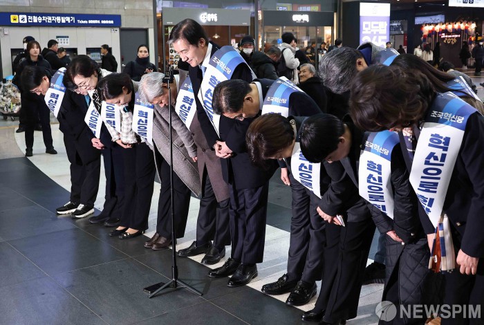 [서울=뉴스핌] 윤창빈 기자 = 조국 조국혁신당 대표를 비롯한 당직자들이 13일 오전 서울 용산구 용산역에서 시민들에 설 귀성인사를 하고 있다. 2026.02.13 pangbin@newspim.com