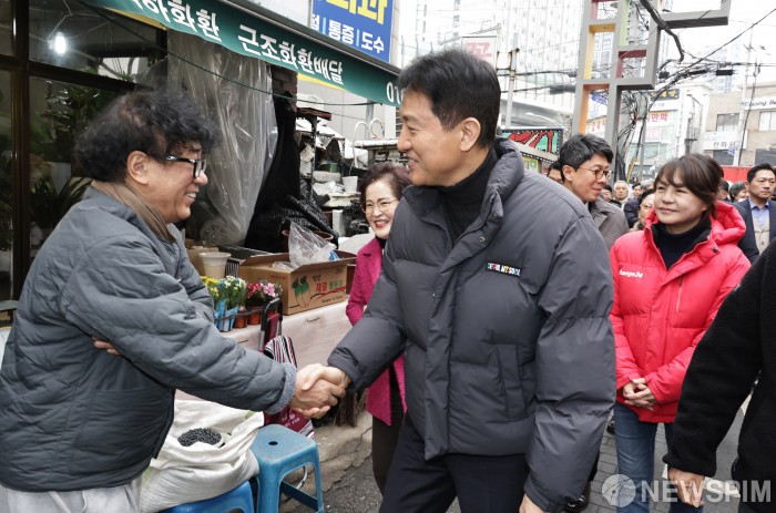 [서울=뉴스핌] 양윤모 기자 = 오세훈 서울시장이 13일 오후 설 명절을 맞아 서울 광진구 자양전통시장을 방문해 주민과 악수하고 있다. 2026.02.13 yym58@newspim.com