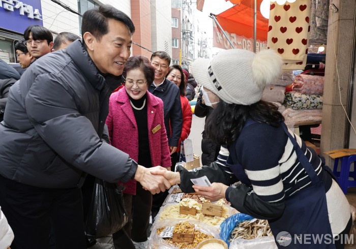 [서울=뉴스핌] 양윤모 기자 = 오세훈 서울시장이 13일 오후 설 명절을 맞아 서울 광진구 자양전통시장을 방문해 견과류를 구입후 상인과 악수 하고 있다. 2026.02.13 yym58@newspim.com