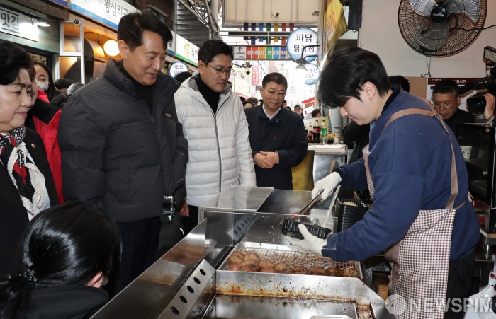 [서울=뉴스핌] 양윤모 기자 = 오세훈 서울시장이 13일 오후 설 명절을 맞아 서울 광진구 자양전통시장을 방문해 떡갈비를 구입하고 있다. 2026.02.13 yym58@newspim.com