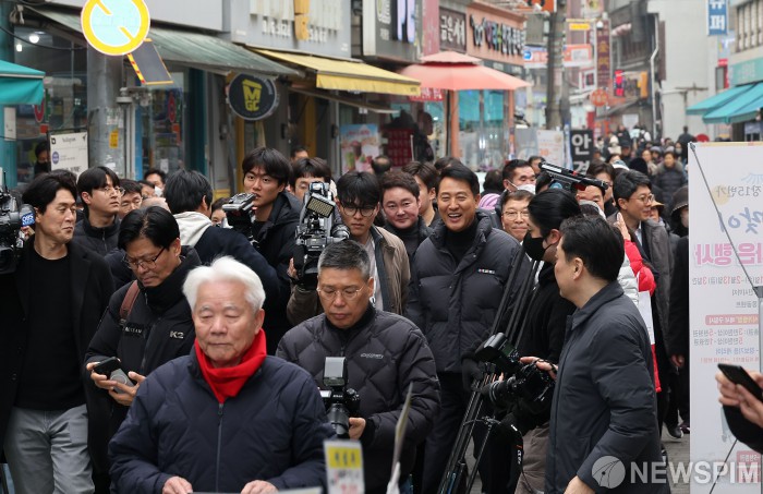 [서울=뉴스핌] 양윤모 기자 = 오세훈 서울시장이 설 연휴를 앞둔 13일 오후 서울 광진구 자양전통시장을 방문해 시장을 둘러보며 상인들과 인사를 나누고 있다. 2026.02.13 yym58@newspim.com