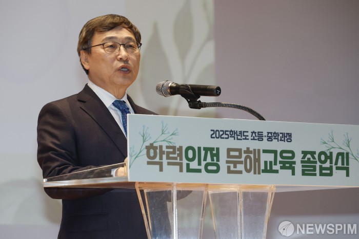 [서울=뉴스핌] 류기찬 기자 = 정근식 서울시교육감이 12일 오후 서울 서초구 서울시교육청 교육연수원에서 열린 '2025학년도 학력인정 문해교육 졸업식'에서 격려사를 하고 있다. 2026.02.12 ryuchan0925@newspim.com
