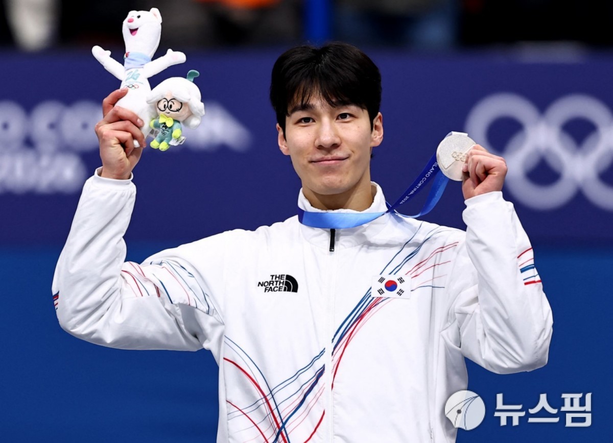 [밀라노 로이터=뉴스핌] 박상욱 기자= 황대헌이 15일(한국시간) 2026 밀라노·코르티나담페초 동계올림픽 쇼트트랙 남자 1500m 시상식에서 포즈를 취하고 있다. 2026.02.15 psoq1337@newspim.com