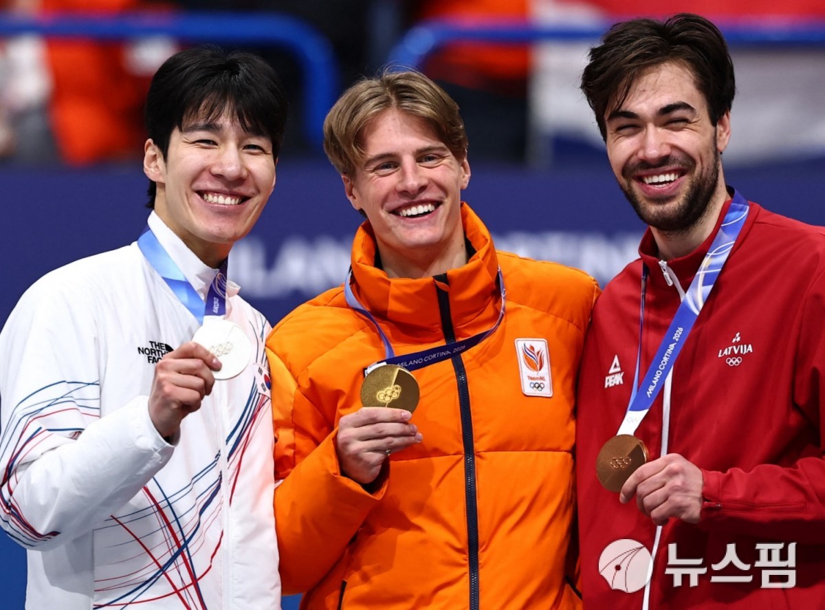 [밀라노 로이터=뉴스핌] 박상욱 기자= 황대헌이 15일(한국시간) 2026 밀라노·코르티나담페초 동계올림픽 쇼트트랙 남자 1500m 시상식에서 금메달리스트 옌스 판트 바우트와 동메달리스트 로베르츠 크루즈베르그스와 포즈를 취하고 있다. 2026.02.15 psoq1337@newspim.com