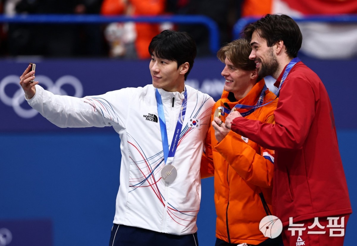 [밀라노 로이터=뉴스핌] 박상욱 기자= 황대헌이 15일(한국시간) 2026 밀라노·코르티나담페초 동계올림픽 쇼트트랙 남자 1500m 시상식에서 금메달리스트 옌스 판트 바우트와 동메달리스트 로베르츠 크루즈베르그스와 빅토리 셀피를 직고 있다. 2026.02.15 psoq1337@newspim.com