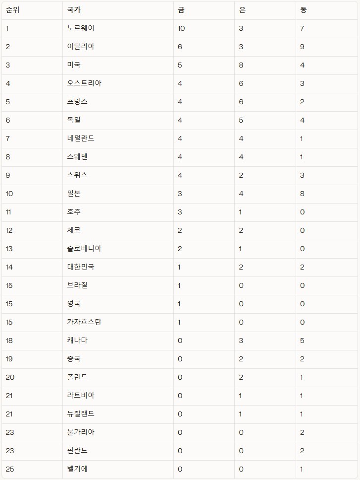 동계올림픽의 최강국 노르웨이가 금메달 10개, 은메달 3개, 동메달 7개로 메달 합계 20개를 채우며 여전히 1위를 고수하고 있다. 개최국 이탈리아가 금메달 6개, 은메달 3개, 동메달 9개로 노르웨이를 쫒고 있다. 미국이 금메달 5개, 은메달 8개, 동메달 8개로 3위에 자리했고 오스트리아가 금메달 4개, 은메달 6개, 동메달 3개 4위다. 프랑스과 독일, 네덜란드, 스웨덴, 스위스가 금메달 4개로 뒤를 잇고 있다. 일본이 금메달 3개, 은메달 4개, 동메달 8개로 10위에 올라 아시아국가 중 유일하게 톱10에 들었다.