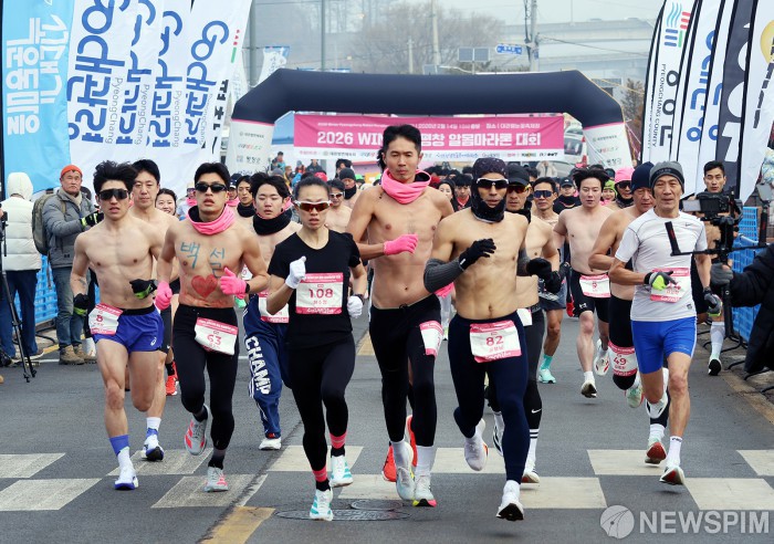 [서울=뉴스핌] 설 연휴 첫째 날인 14일 강원특별자치도 평창군 대관령면 대관령로 대관령눈꽃축제장에서 열린 ‘2026 평창 대관령 알몸 마라톤 대회’참가자들이 힘차게 출발하고 있다. 이날 전국에서 모인 450여명의 마라톤 동호인들이 알몸 차림으로 5㎞, 10㎞코스를 달리며 대관령 한겨울의 추위를 즐겼다. [사진=평창관광문화재단] 2026.02.15 photo@newspim.com